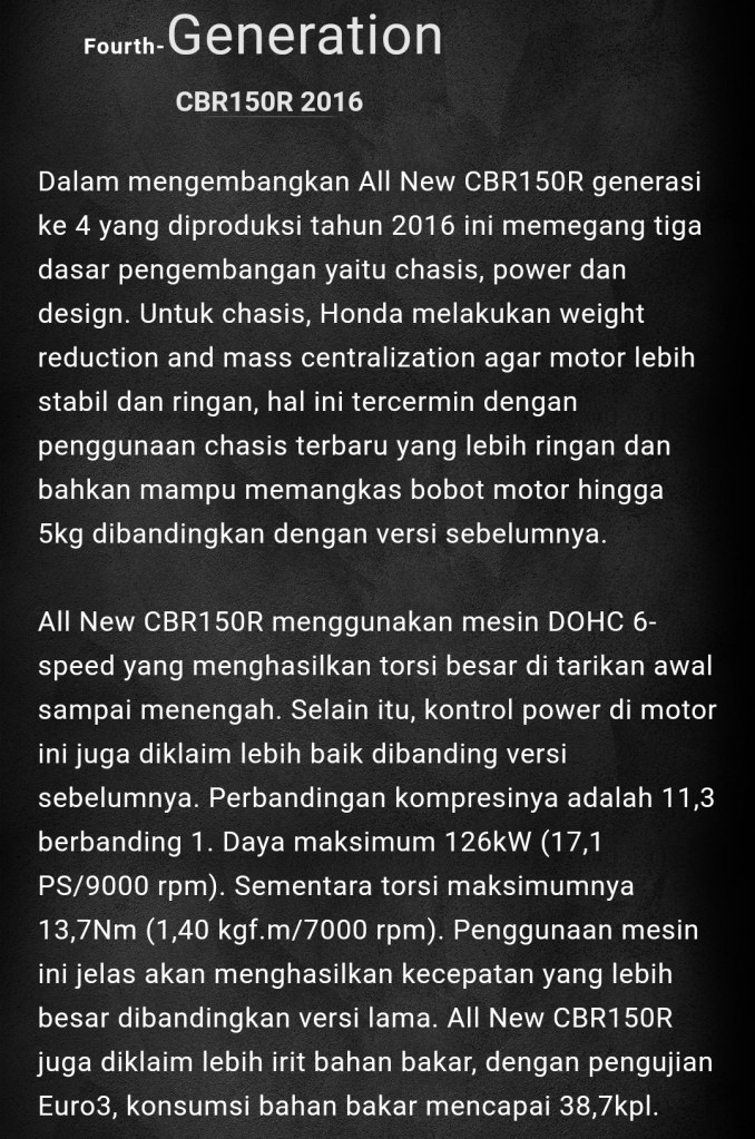 Menggunakan Mesin DOHC 150cc, 6-Kecepatan, 4-Katup, 4-Langkah, dan teknologi PGM-FI, mampu menghasilkan kecepatan tinggi yang responsif, sangat irit bensin, juga ramah lingkungan.
